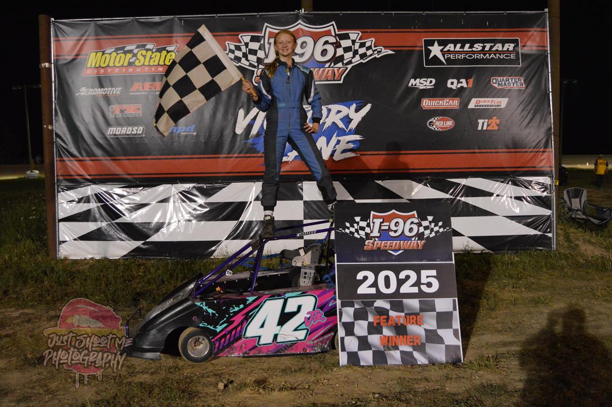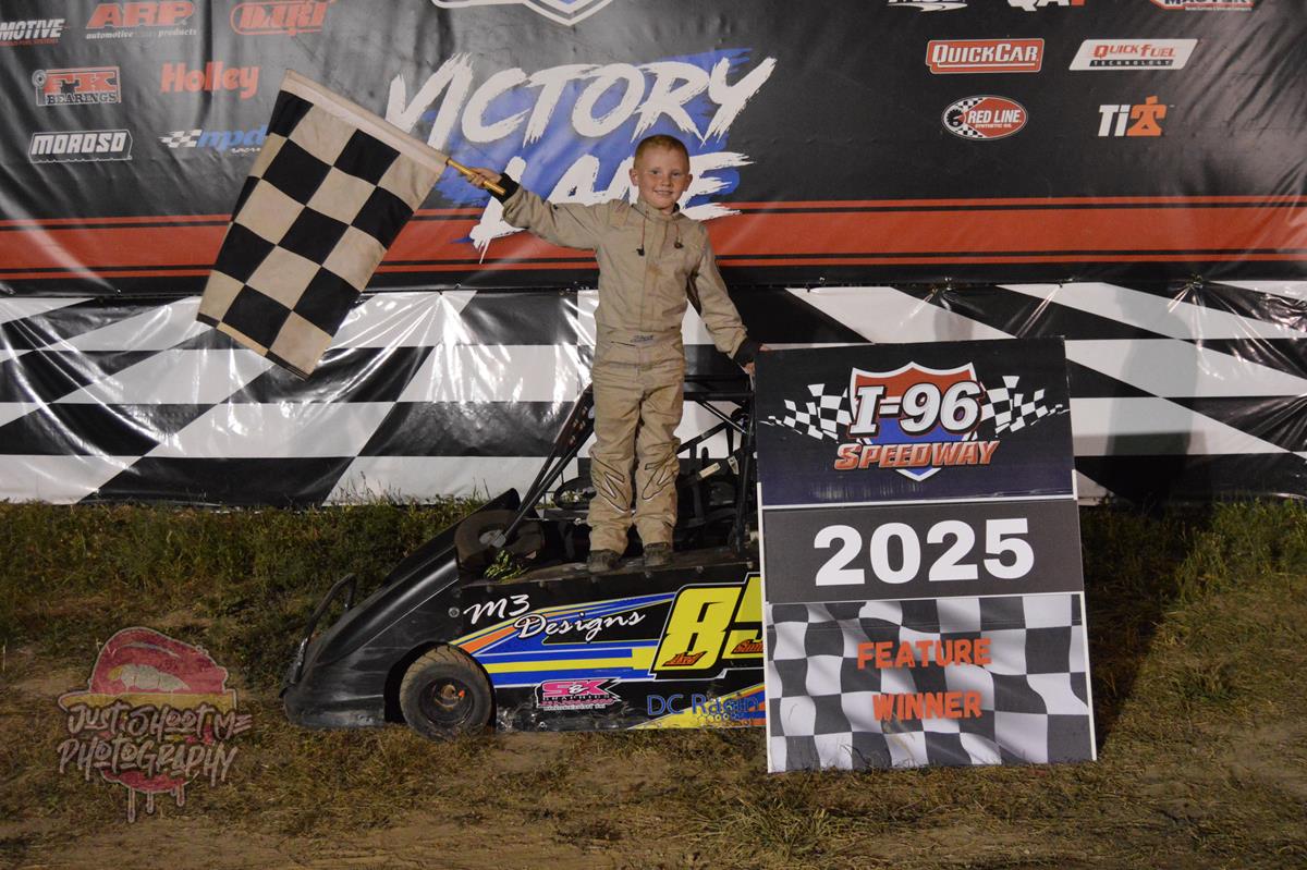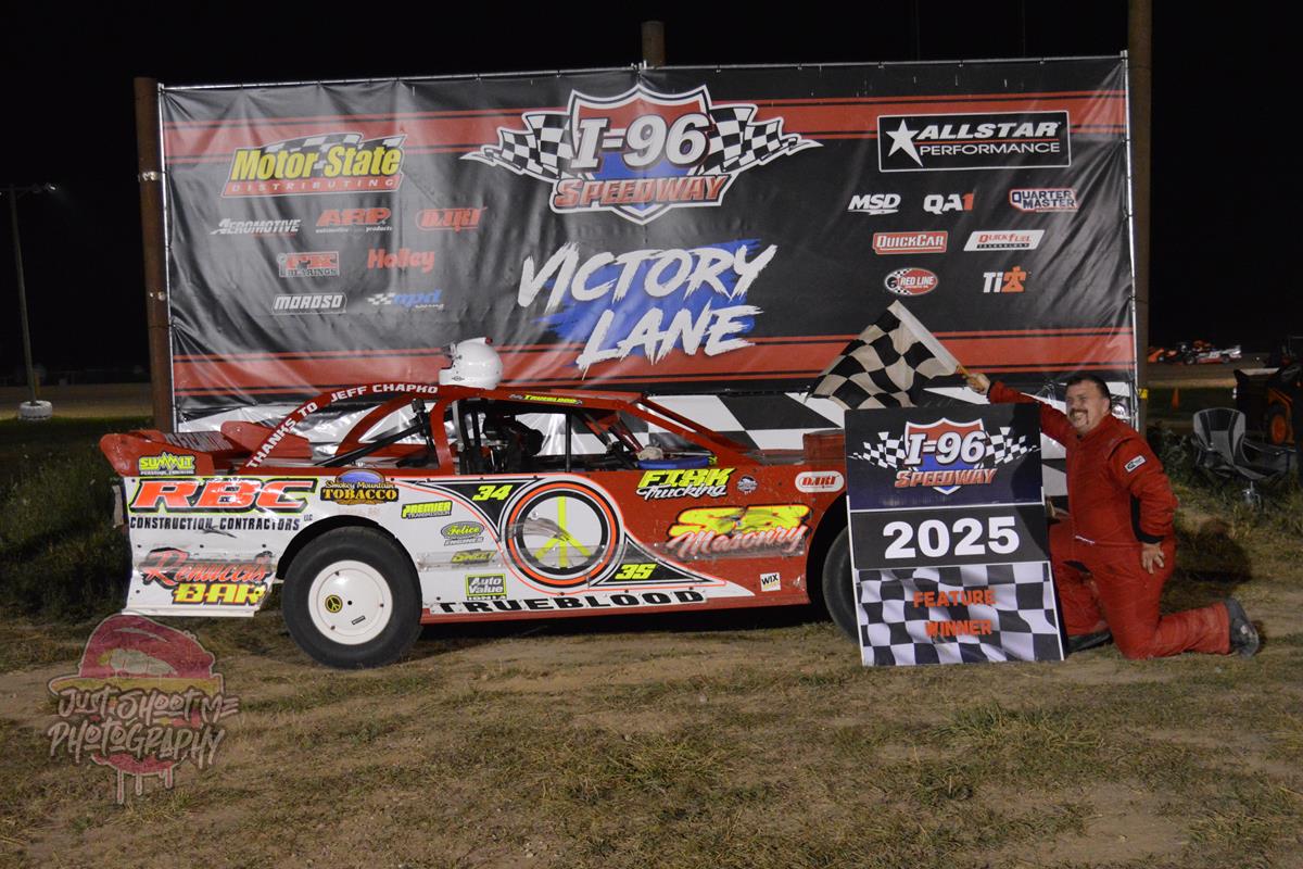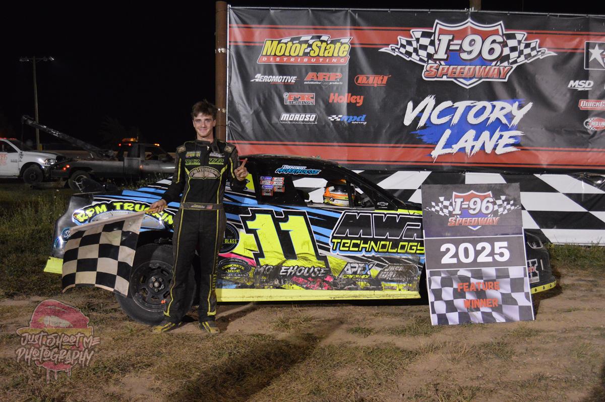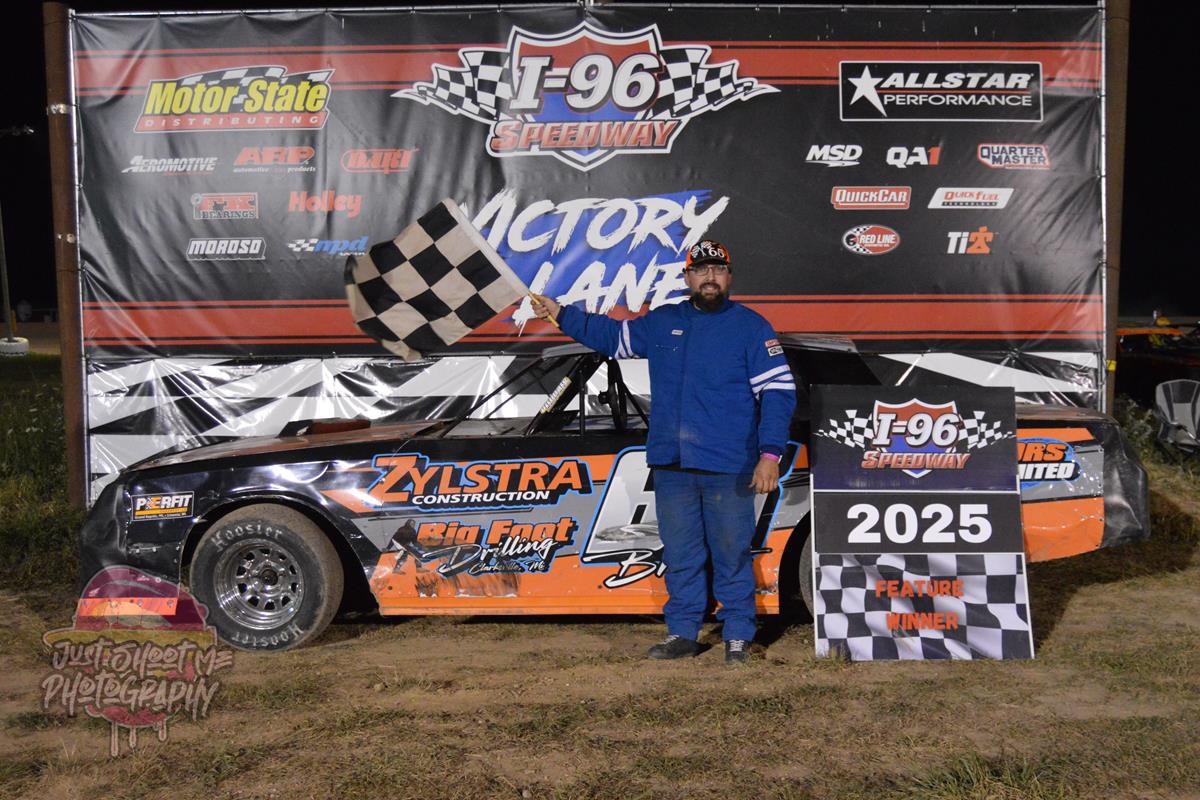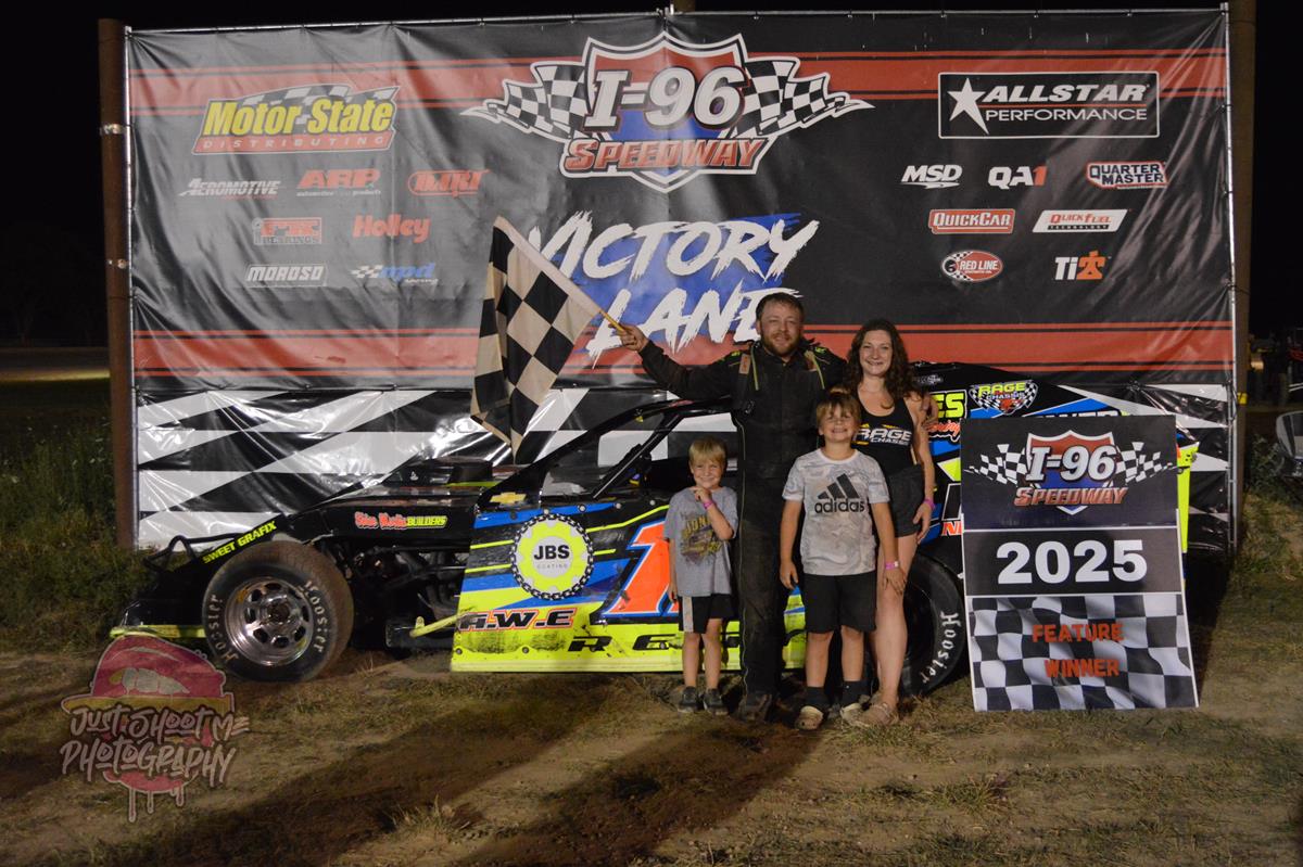 Every week, point leader, “The Real Deal” Jeff Reay, seems to have tough odds to overcome, and somehow, every week, he overcomes them. This week would be no different as it would have the #12 machine starting from the 10th position trying to get by some of the best Modified drivers in the nation and we would see him succeed to capture feature win number 6 at I-96 for the 2025 season. The race would begin with “The Portland Powerhouse” Casey Smith leading the first 3 laps with a brand new power plant in the #83. Smith would be overtaken by veteran driver, #7 Myron Deyoung, on lap 4. Deyoung would hold the lead until lap 13 when Reay finally found his way through the field to take the lead on lap 14 and cruise to victory. 1st-#12 “The Real Deal” Jeff Reay 2nd-#7 Myron Deyoung 3rd-#71 Brenten Deyoung 4th-#19jr Kody Johnson 5th-#05 Ryan Heskett. Heat winners were Johnson and Myron Deyoung.