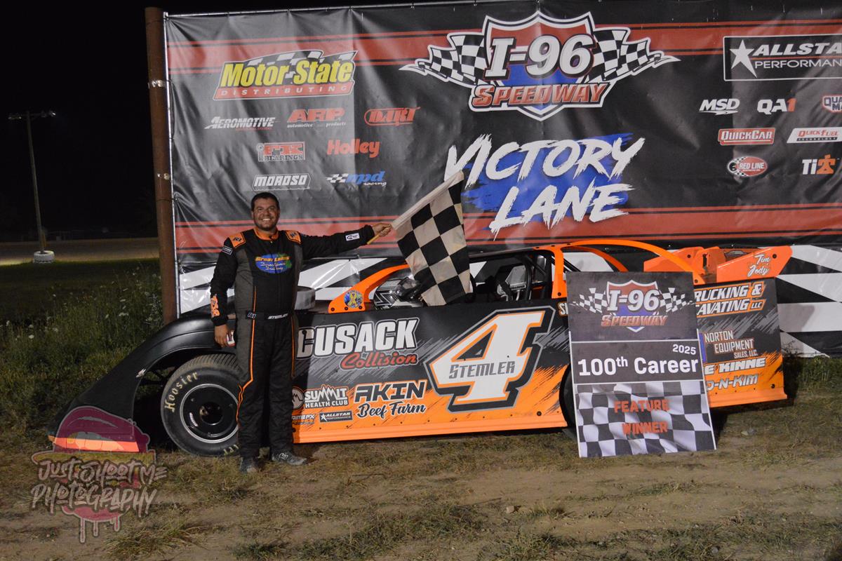 It was an historic night for one of our local drivers in the UMP Late Model class. Travis Stemler won his first Feature back in 2006 in the Street Stock division at I-96 Speedway, so it would only be fitting to collect Feature win number 100 at the very same track, this time winning in UMP Late Model action. The race would start with #21 Logan Nickerson leading lap 1 from the pole but be quickly overtaken by #18 Chase Burda. Chase looked like he was in line to capture the checkered until a late race caution bunched the field back up. Before that caution came out, Stemler, who was running 3rd in the bottom groove along with Nickerson and Burda, would jump to the outside to see if there was anything up there. After the caution, turns out there was as Stemler would use the high side to take the lead on lap 15 and never look back going on to visit victory lane for his 100th career Feature win. 1st-#4 Travis Stemler 2nd-#21 Logan Nickerson 3rd-#18 Chase Burda 4th-#27 Eric Spangler 5th-#42 Chad Finley. Heat winners were Stemler and Nickerson and fast time was a 15.762 also by Stemler. So a complete sweep on an already historic night for the 4 team.