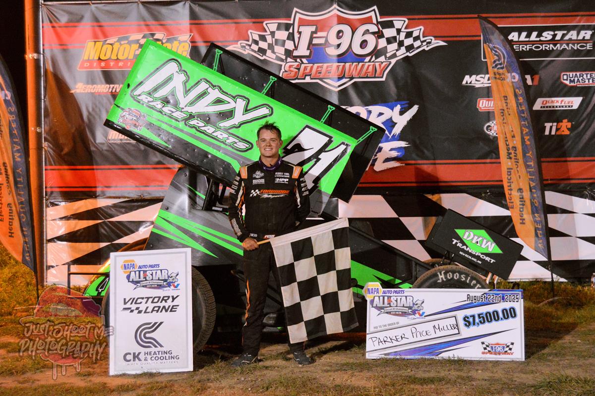 Starting on the pole for the Napa Auto Parts All Star Circuit of Champions 410 Winged Sprints in the feature was #17GP Tim Shaffer. He would lead lap 1, and give up the top spot on lap 2 to “The Lawfirm” Parker Price Miller before taking it back again and leading from lap 3 to lap 11. #49X Cale Thomas would get around Shaffer and lead for a couple of laps before surrendering the lead to eventual winner, “The Lawfirm” Parker Price Miller. Miller would take the lead on lap 14 and never look back to park it in the Lane Automotive/Allstar Performance Victory Lane to close out the final Michigan date on the tour for the ASCOC. 1st-#71 “The Lawfirm” Parker Price Miller 2nd-#4 Zane Devault 3rd-#17GP Tim Shaffer 4th-#1 Nate Dussel 5th-#11N Kasey Jedrzrjek. They ran a 6 car dash to determine the top 6 starting positions, and that would put the #17GP Tim Shaffer on the pole for the A-Main after winning the dash. Heat winners were #49X Cale Thomas, #4 Zane Devault, and #45 Devon Borden. Fast Time was a 13.186 by #71 “The Lawfirm” Parker Price Miller.